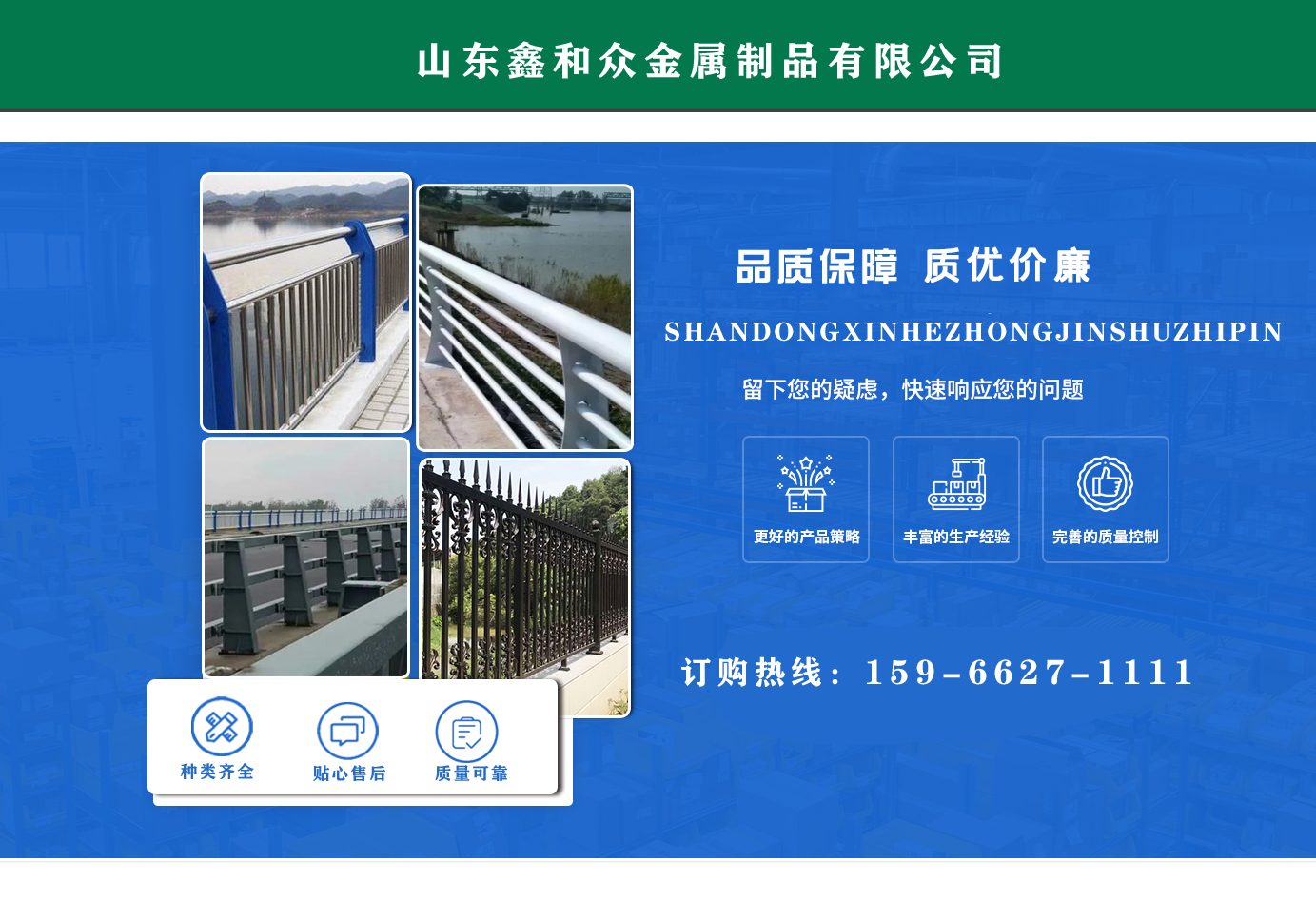 山東鑫和眾金屬制品有限公司主要產(chǎn)品有防撞護欄,橋梁護欄,道路護欄,河道護欄,不銹鋼護欄等護欄。提供設(shè)計方案,一站式定制,包您滿意價格優(yōu)惠,歡迎來電咨詢! 公司常年從事銷售護欄防撞護欄,橋梁護欄,道路護欄,河道護欄,不銹鋼護欄,橋梁鋼護欄,河道燈光護欄等。產(chǎn)品廣泛應(yīng)用于橋梁、河道、旅游景區(qū)、道路、公路、公園、小區(qū)、景觀、道路防撞等領(lǐng)域。 公司產(chǎn)品均采用優(yōu)質(zhì)不銹鋼材料,符合相關(guān)標(biāo)準(zhǔn)。各種型號不銹鋼復(fù)合管及護欄,質(zhì)量嚴格把控。產(chǎn)品強度高、耐腐蝕、焊接牢固、抗沖擊、性能好,防撞護欄結(jié)構(gòu)簡單、美觀實用大方?! g迎前來訂購!...
